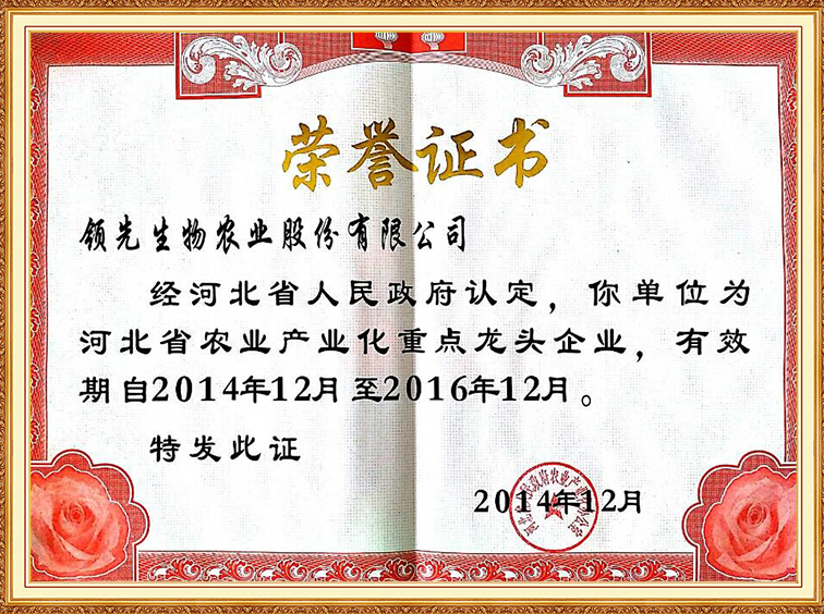 河北省農(nóng)業(yè)產(chǎn)業(yè)化重點龍頭企業(yè)證書