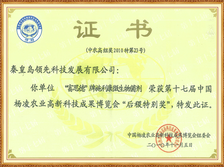 “富思德”牌施利康微生物菌劑—第十七屆中國楊凌農(nóng)博會(huì)“后稷特別獎(jiǎng)”